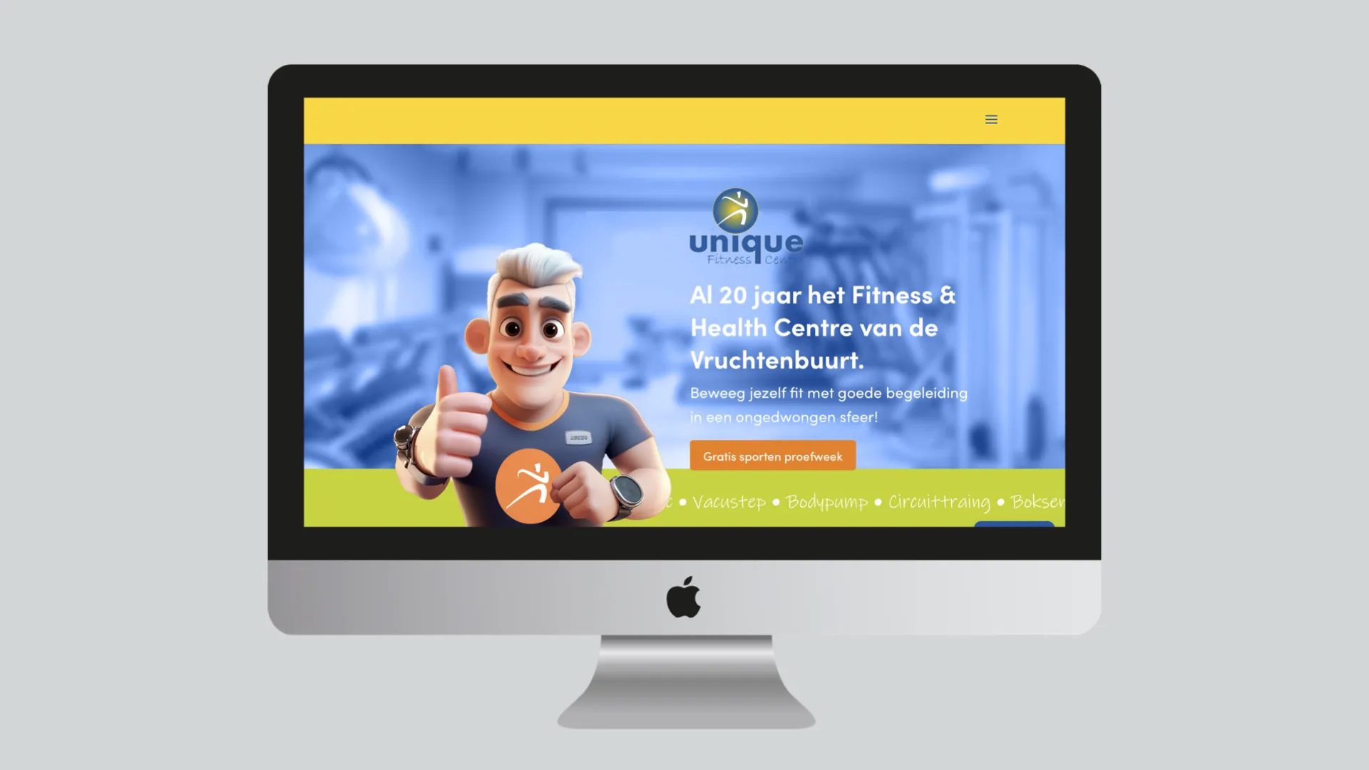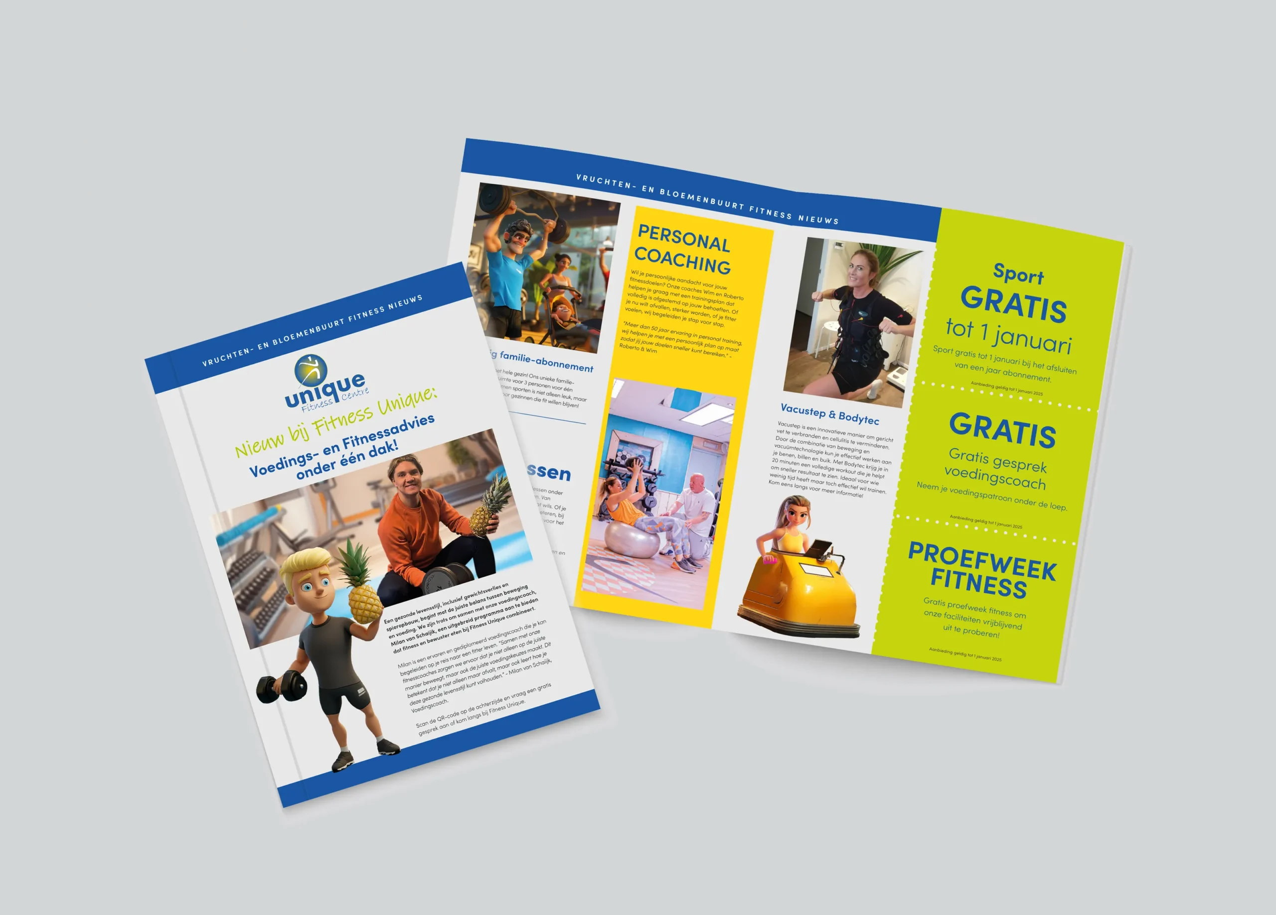 We maakten een conversiegerichte website in knallend blauw en gaven het merk een eigen gezicht met illustraties in Pixar-stijl, afgewisseld met fotografie van het team. Met lokale Google Ads en een huis-aan-huis flyeractie haakten we in op piekmomenten in het jaar. In Canva bouwden we templates zodat het team zelfstandig consistente posts kan maken; die versterken we met Social Media Advertising. Samen met diëtist Milan lanceerden we het programma Binnen 12 weken fit (kleine groepen, focus op voeding, trainen en volhouden). Ondertussen optimaliseren we landingspagina’s, campagnes en klantreis continu op conversie.